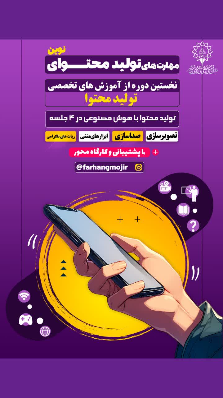مهارت های تولید محتوای نوین با محوریت «تولید محتوا با هوش مصنوعی» نخستین دوره از آموزش های تخصصی در حوزۀ رسانه است که به همت سازمان فرهنگی اجتماعی ورزشی شهرداری خمینی شهر درحال برگزاری است. به گفتۀ سید محمدهادی موسوی، مدیر عامل سازمان، دورۀ تولید محتوا با رویکردهای مختلف و در دو سطح مقدماتی و پیشرفته برگزار خواهد شد. وی افزود: برگزاری دوره های آموزشی نظری در حوزۀ رسانه و ویژۀ فعالان فضای مجازی نیز در دستور کار قرار دارد.