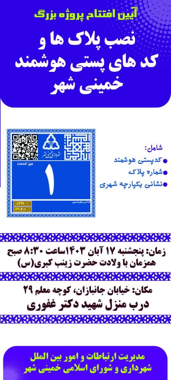 آیین افتتاح پروژۀ بزرگ نصب پلاک ها و کدهای پستی هوشمند خمینی شهر به همت مدیریت ارتباطات و امور بین الملل شهرداری و شورای اسلامی در روز پنج شنبه 17 آبان برگزار شد.