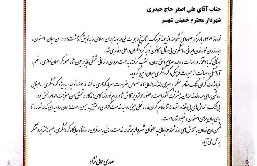 شهردار خمینی شهر به عنوان شهردار برتر در خدمت رسانی به مسافران نوروزی ۱۴۰۳ و ارتقاء جایگاه گردشگری انتخاب شد و از سوی دکتر جمالی نژاد، استاندار محترم، لوح تقدیر دریافت کرد.