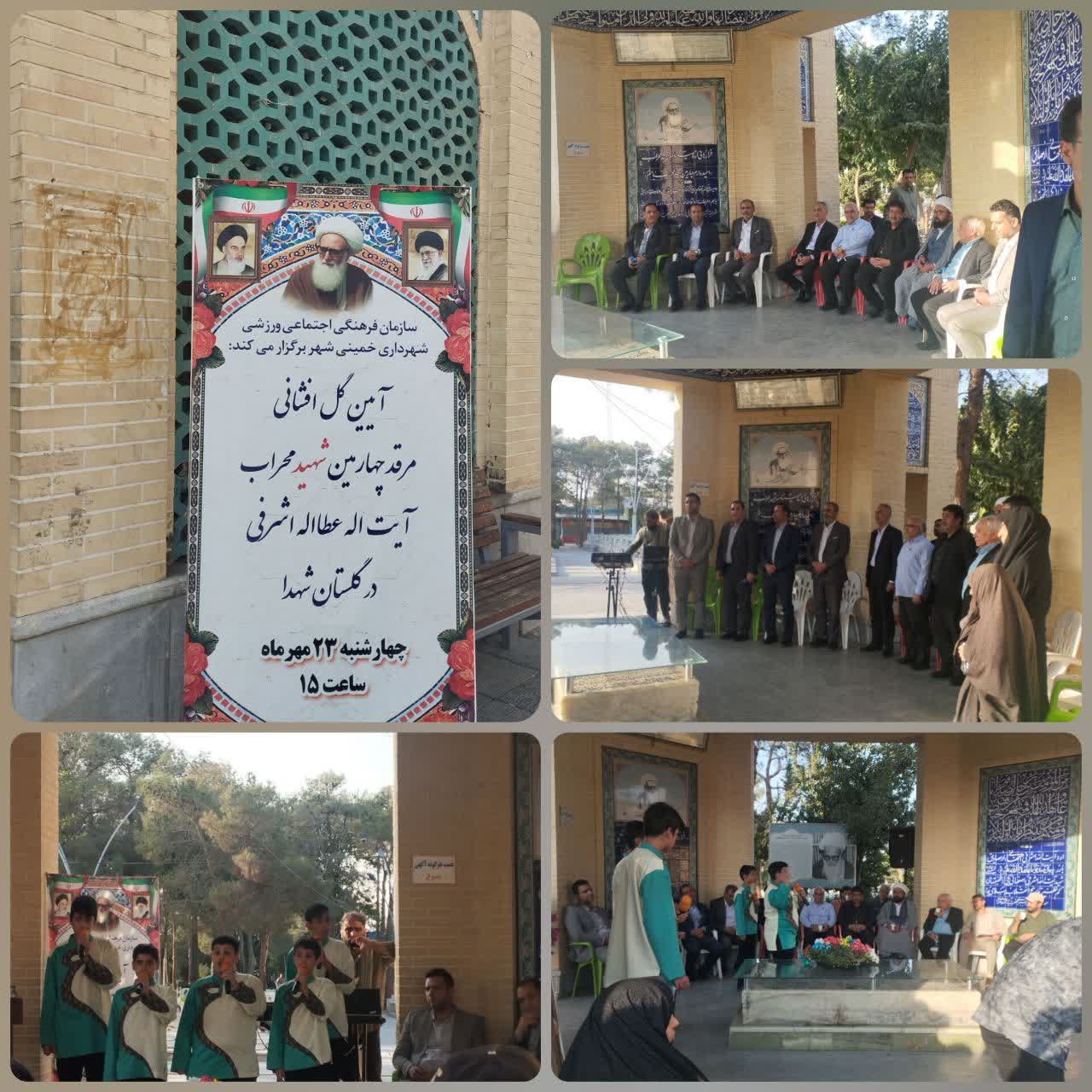 به همت سازمان فرهنگی اجتماعی ورزشی شهرداری خمینی شهر آیین گل افشانی آرامگاه شهید آیت الله اشرفی، چهارمین شهید محراب، در روز چهارشنبه 23 مهر، سال روز شهادت ایشان، در گلستان شهدای اصفهان برگزار شد. در این مراسم اعضای محترم شورای شهر، فرماندار و شهردار محترم، معاون محترم فرهنگی اجتماعی شهردار، مدیران محترم شهرداری، رئیس محترم بنیاد شهید و امور ایثارگران و عموم مردم شرکت داشتند. گفتنی است خواهر شهید نیز مردم شهیدپرور خمینی شهر را در این مراسم همراهی کردند.