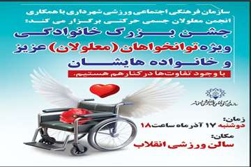 به همت سازمان فرهنگی اجتماعی ورزشی شهرداری خمینی شهر و با همکاری انجمن معلولان (توان خواهان) جسمی حرکتی جشن بزرگ خانوادگی ویژۀ توان‌خواهان و خانواده‌های عزیزشان در روز دوشنبه ۱۷ آذرماه، از ساعت ۶ عصر و در سالن ورزشی انقلاب برگزار می شود. گفتنی است این مراسم فقط ویژۀ عزیزان توان‌خواه و خانواده‌های ایشان است.