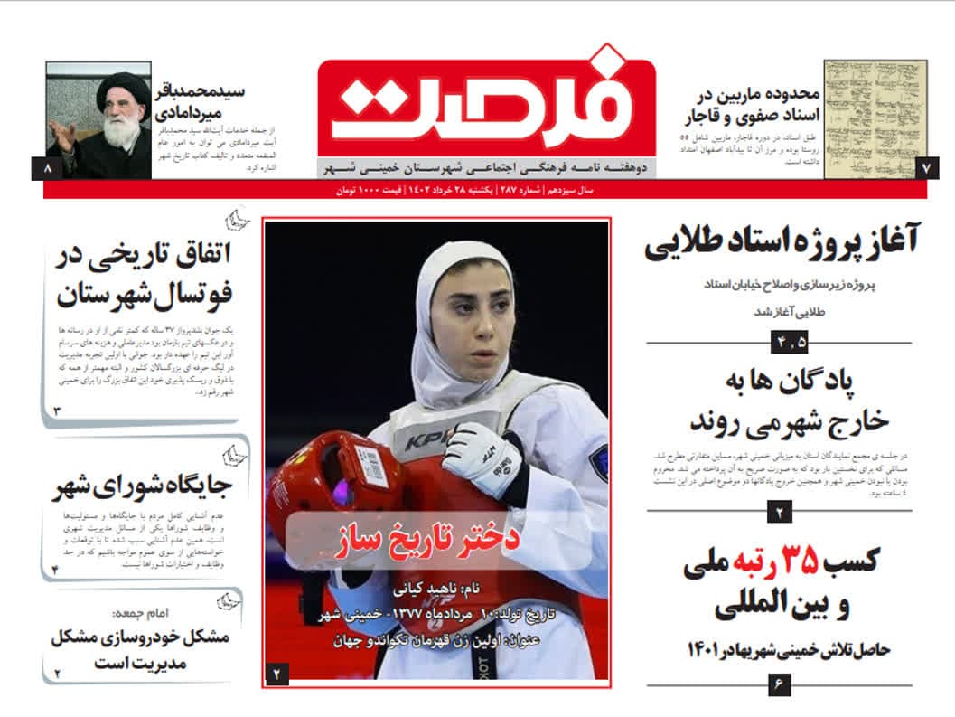 در این شماره می خوانید: ����دختر تاریخ ساز؛ ����این روزها قهرمانی یک ورزشکار دختر ایرانی حسابی بر سر زبان ها افتاده است و رسانه ها از او تمجید می کنند. ناهید کیانی (زاده ۱۰ مرداد ۱۳۷۷/ خمینی شهر) تکواندوکار ایرانی است که با عنوان اولین زن قهرمان تکواندو جهان تاریخ ساز شد. ����ناهید کیانی با کسب مدال طلای تکواندوی قهرمانی جهان تنها مدال آور کاروان ۱۵ نفره ایران در این مسابقات نام گرفت و برای نخستین بار مدال طلای جهان را برای تکواندوی زنان ایران بدست آورد. ����کسب 35 رتبه ملی و بین المللی حاصل تلاش نوجوانها و جوانهای خمینی شهری در سال 1401 + جدول اسامی ����محدوده ماربین در اسناد صفوی و قاجار؛