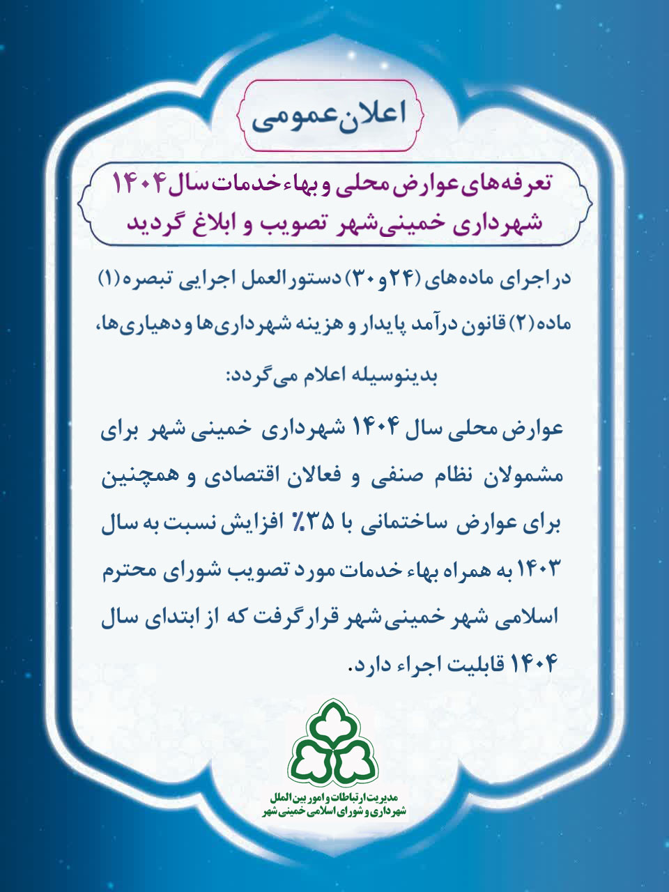 تعرفۀ عوارض و بهای خدمات شهرداری خمینی شهر در سال 1404